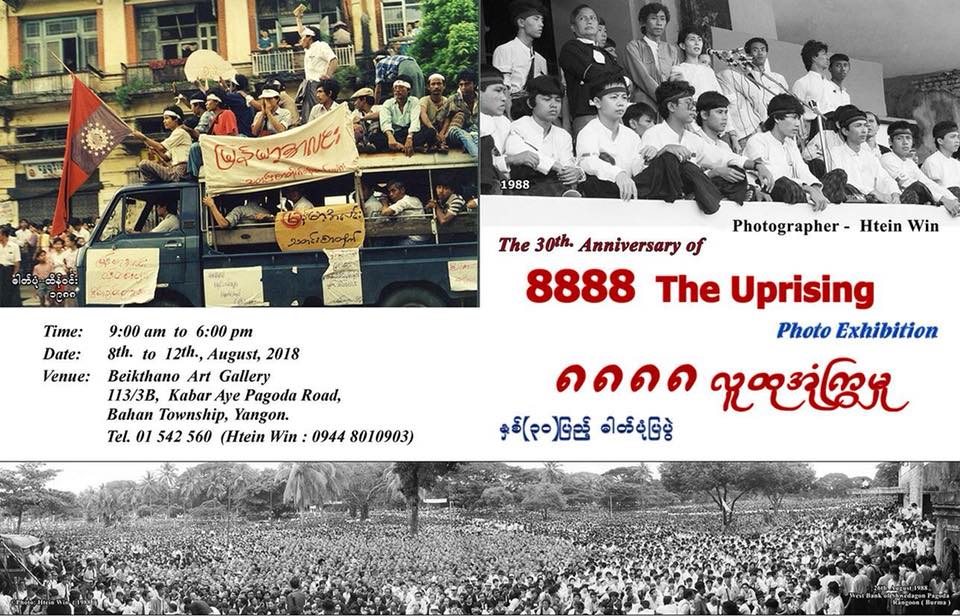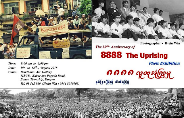 ၈၈၈၈ႏွစ္ ၃၀ျပည့္ အထိမ္းအမွတ္အျဖစ္ ဓာတ္ပံုထိန္ဝင္းရဲ႕၈၈၈၈ လူထုအံုႂကြမႈလို႔ အမည္ေပးထားတဲ့ဓာတ္ပံုျပပြဲ ရန္ ကုန္ၿမိဳ႕ဗဟန္းၿမ္ိဳ႕နယ္ကမၻာေအးဘုရားလမ္း အမွတ္ ၁၁၃၊3Bရွိ ဗိႆႏိုး galleryမွာ ၾသဂုတ္လ ၈ရက္ေန႔မွစတင္ကာ ၾသဂုတ္လ ၁၂ရက္ထိ နံနက္၉နာရီကေန ညေန ၆နာရီထိ ျပသလ်က္ရွိပါတယ္။
