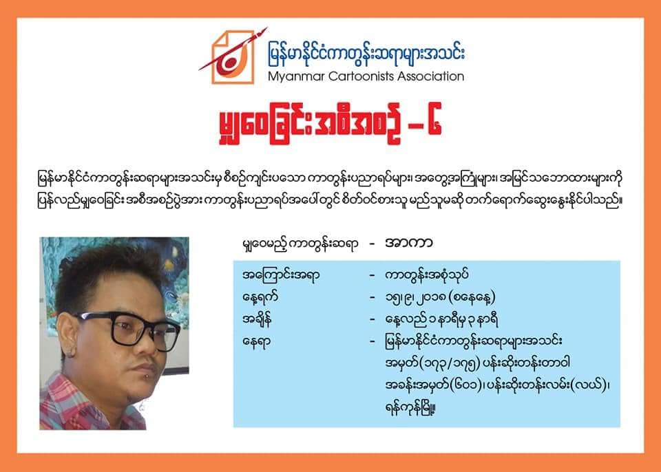ျမန္မာႏိုင္ငံကာတြန္းဆရာမ်ားအသင္းလူမႈကြန္ရက္စာမ်က္ႏွာမွာလည္း ကာတြန္းခ်စ္သူမ်ား မည္သူမဆို လာေရာက္ နားေထာင္ၿပီးသိလိုသည္မ်ားကိုလည္း အျပန္အလွန္ ေမးျမန္းေဆြးေႏြးၾကဖို႔ ဖိတ္ေခၚထားပါတယ္။