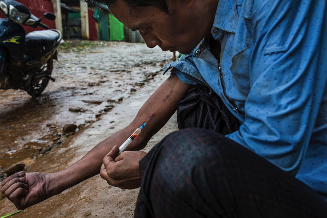 ဆိုင္းေတာင္ၿမိဳ႕လမ္းမ တစ္ေနရာတြင္ ဘိန္းျဖဴထိုးသြင္းေနသူတစ္ဦး၊ ဖားကန္႔၊ ဩဂုတ္လ၊