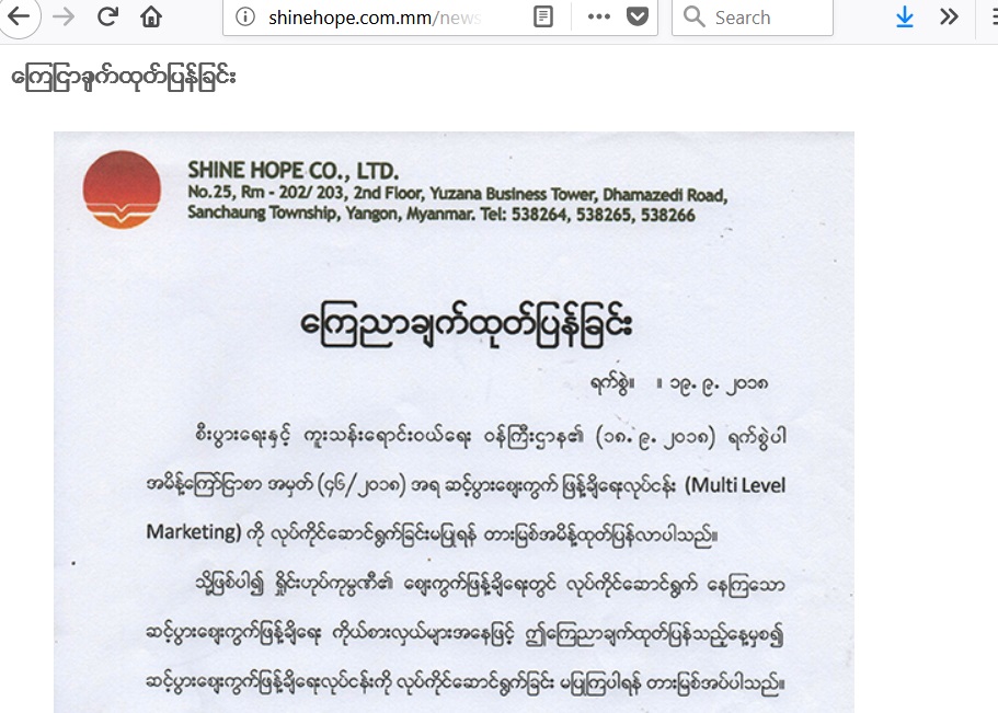 (Multi Level Marketing – MLM) လုပ္ကိုင္ျခင္းကို တားျမစ္ေၾကာင္း စီးပြားေရးႏွင့္ကူးသန္းေရာင္းဝယ္ေရးဝန္ႀကီးဌာနက စက္တင္ဘာ ၁၈ တြင္ ေၾကညာသည္။