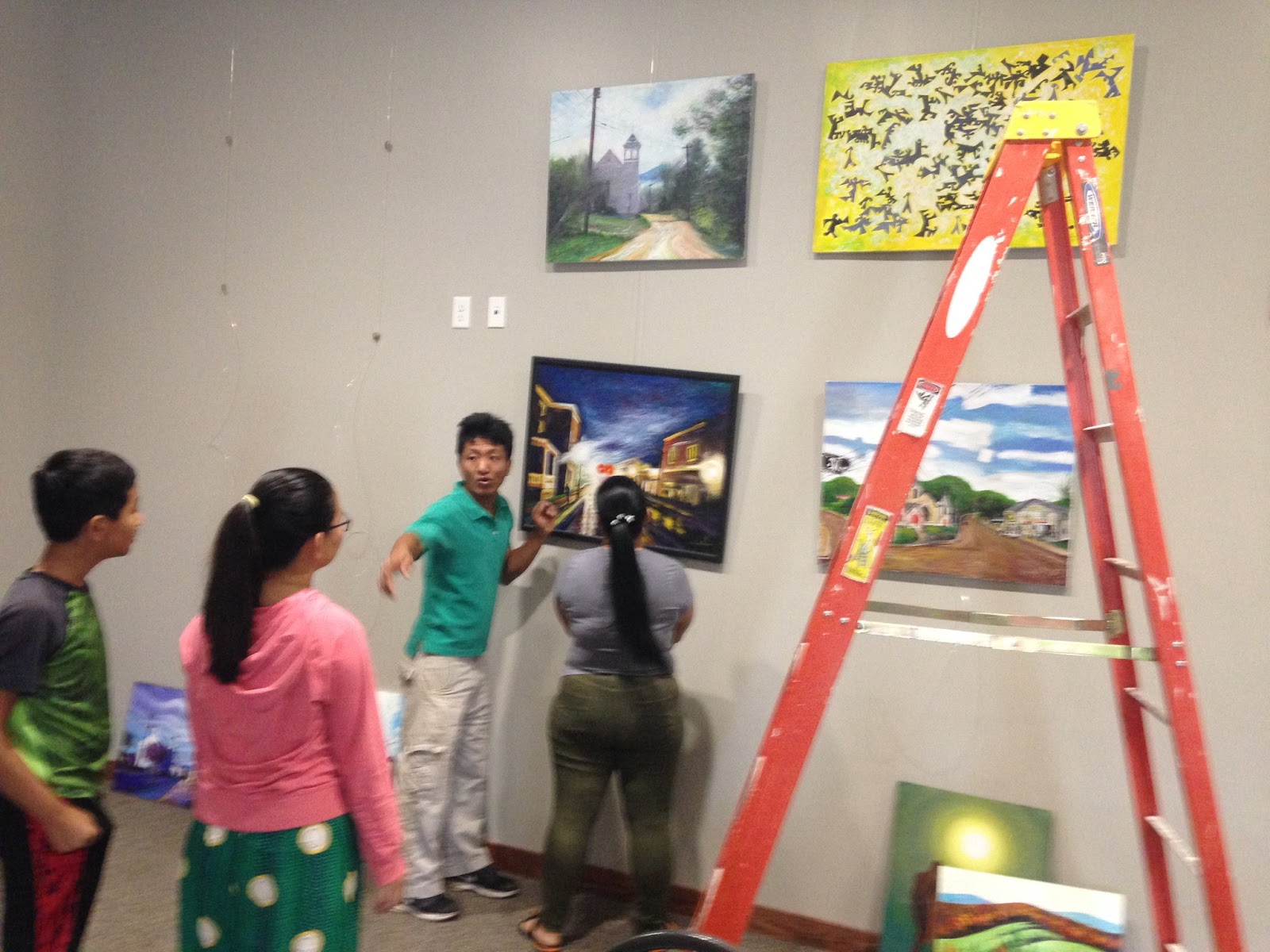 ၂၁ရက္ေသာၾကာေန႔ က စၿပီးပန္းခ်ီကားေတြခ်ိတ္ပါတယ္ တေယာက္ထဲ ဂ်ိတ္ေတြ ၾကိဳးေတြလည္း တပ္ရတာဆိုေတာ့မၿပီးပါဘူး၊ ဒီေန႔ ၂၂ရက္ စေနေန႔ကေတာ့ ကိုေဒးဗစ္တို႔ေမာင္ႏွမေတြ လာကူၾကလို႔ အားလံုး နံရံေပၚမွာ တနလၤာေန႔အတြက္ အဆင္သင့္ ျဖစ္ပါၿပီ ။ စိတ္ေရာကိုယ္ပါ အားတက္သေရာကူညီခဲ့ၾကတဲ့ ခ်စ္စရာေကာင္းတဲ့ ခရစ္ယာန္ဘာသာဝင္ ခ်င္းတိုင္းရင္းသား ညီငယ္နဲ႔ တူ တူမမ်ားေက်းဇူးကို အၿမဲတမ္းအမွတ္ရေနမွာပါ ။