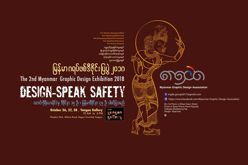 ျမန္မာဂရပ္ဖစ္ဒီဇိုင္းအသင္း Myanmar Graphic Design Association မွ က်င္းပေသာ “ဒီဇိုင္းျဖင့္ေျပာေသာ လူသားဘဝ လုံုျခံဳမႈ”အမည္ရွိ ျမန္မာဂရပ္ဖစ္ဒီဇိုင္းျပပြဲ(၂၀၁၈)ကို ရန္ကုန္ၿမိဳ႕အလံုလမ္းျပည္သူ႔ဥယ်ာဥ္အတြင္းရွိ YANGON Galleryမွာ ယေန႔ ေအာက္တိုဘာ၂၆ ရက္မွ ၂၈ ရက္တိုင္ မနက္ ၁၀ နာရီကေန ညေန ၆နာရီထိျပသေနပါတယ္။