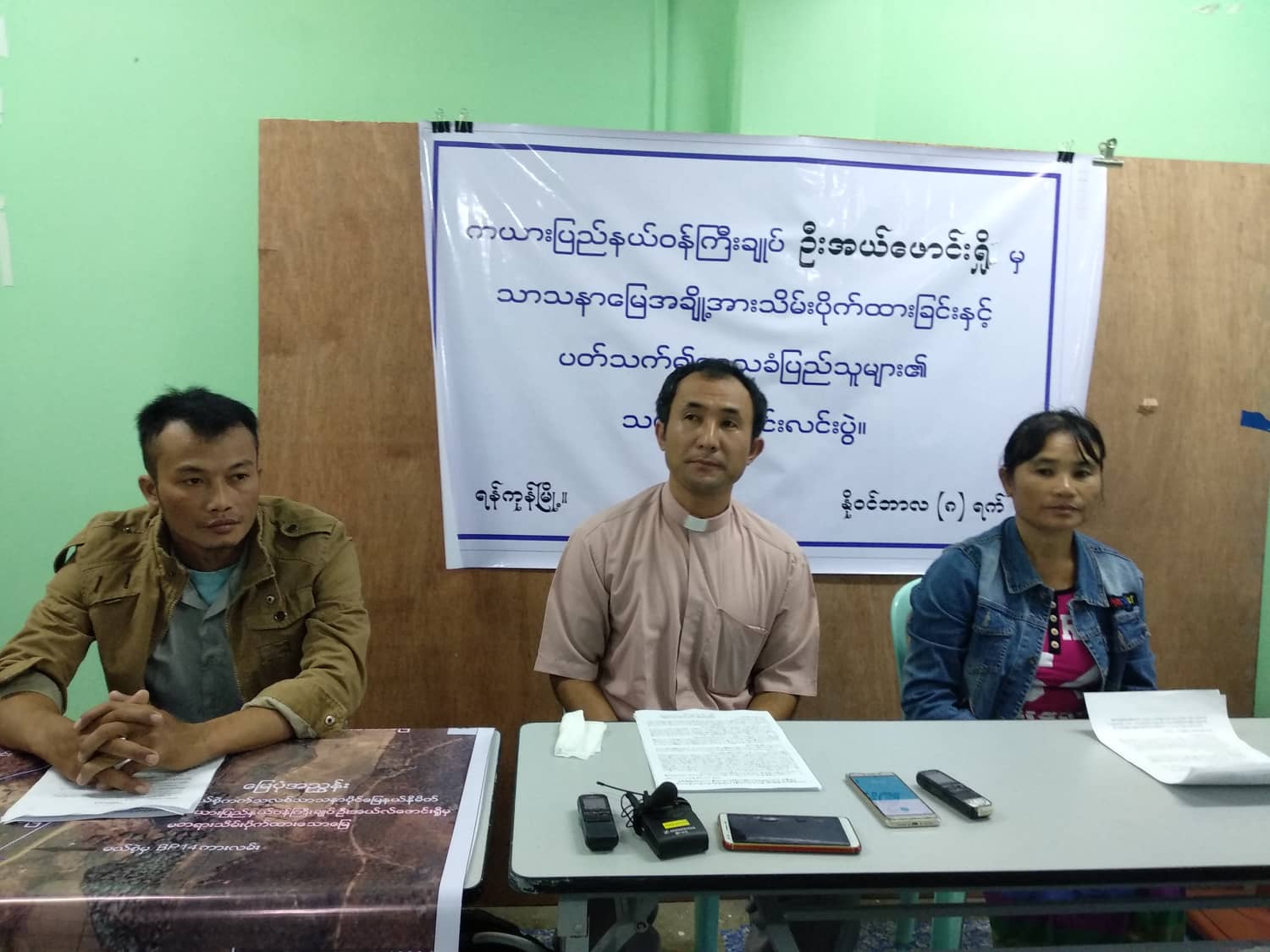 မယ္စဲ့ၿမိဳ႕အျငင္းပြားဖြယ္ ေျမကြက္ႏွင့္ ပတ္သက္ၿပီး ႏိုဝင္ဘာ ၈ ရက္ေန႔က ရန္ကုန္တြင္ သတင္းသမားတို႔ကို ရွင္းျပေနေသာ လြိဳင္ေကာ္ ကက္သလစ္ သာသနာ၏ ေက်ာင္းထိုင္ ဘုန္းေတာ္ႀကီး ရစ္ခ်က္သူရထြန္းႏွင့္ ေဒသခံႏွစ္ဦး (ဓာတ္ပံု – ထိုက္နႏၵာဝင္း/Myanmar Now)