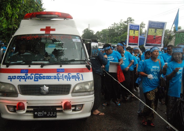 ျပည္သူ႔ရင္ျပင္တြင္ က်င္းပျပဳလုပ္သည့္ “အျပည္ျပည္ဆိုင္ရာၿငိမ္းခ်မ္းေရးေန႔” လႈပ္႐ွားမႈ အခမ္း အနားသို႔ နာေရးကူညီမႈအသင္း(ရန္ကုန္)မွ အသင္းသား/သူမ်ားတို႔သည္ နံနက္ (၈းဝဝ) နာရီအခ်ိန္တြင္ ေရာက္႐ိွလာခဲ့ၿပီး သတ္မွတ္ထားေသာ ေနရာဆိုင္ခန္း၌ ၿငိမ္းခ်မ္းေရးကဗ်ာမ်ား၊ ၿငိမ္းခ်မ္းေရး ပန္းခ်ီ ကားခ်ပ္မ်ားျဖင့္ အလွဆင္ၿပီး “ျဗဟၼစိုရ္ခရီးသြား အႏုပညာ႐ွင္သံုးဦးတို႔၏ ၿငိမ္းခ်မ္းေရးစကားဝိုင္း” DVD အေခြမ်ား ေရာင္းခ်ခဲ့သည္။ မြန္းတည့္ (၁၂းဝဝ) နာရီအခ်ိန္တြင္ ရန္ကုန္ၿမိဳ႕ မဟာဗႏၶဳလပန္းၿခံေ႐ွ႕ ၿမိဳ႕ေတာ္ခန္းမမွစတင္၍ ၿငိမ္းခ်မ္းေရးအားေ႐ွ႕႐ႈ၍ ၿငိမ္းခ်မ္းစြာစီတန္းလွည့္လည္ လမ္းေလွ်ာက္ျခင္းအား ၿငိမ္းခ်မ္းေရး လိုလားေတာင္းတၾကသည့္ ရဟန္းသံဃာမ်ား၊ လူႀကီး၊ လူငယ္မ်ား၊ လူမ်ိဳးဘာသာျခားမ်ား စံုလင္စြာျဖင့္ ေလွ်ာက္လွမ္းခဲ့ရာ အလံုၿမိဳ႕နယ္၊ ၾကည့္ျမင္တိုင္ၿမိဳ႕နယ္၊ စမ္းေခ်ာင္းၿမိဳ႕နယ္ အသီးသီးမ်ားမွွ ျပည္သူ႔ရင္ျပင္ “အျပည္ျပည္ဆိုင္ရာၿငိမ္းခ်မ္းေရးေန႔” လႈပ္႐ွားမႈအခမ္းအနားသို႔ ေလွ်ာက္လွမ္းၾကရာတြင္ ရာသီဥတု ေဖာက္ျပန္ျခင္း၊ ကိုယ္လက္မ်ား ကိုက္ခဲနာက်င္ျခင္း၊ မူးေဝေမာပန္းျခင္း၊ ထိခိုက္ဒဏ္ရာရ႐ိွျခင္း တို႔အတြက္ နာေရးကူညီမႈအသင္း(ရန္ကုန္)႐ိွ အေရးေပၚကယ္ဆယ္ေရးအဖြဲ႔ဝင္မ်ားသည္ က်န္းမာေရး ေစာင့္ေ႐ွာက္မႈ (ေဆးကူညီမႈ)ေပးရန္ လူနာတင္ယာဥ္ျဖင့္ ညေန (၅းဝဝ) နာရီအခ်ိန္ထိ လိုက္ပါ၍ ကူညီ ေဆာင္႐ြက္ေပးခဲ့သည္။