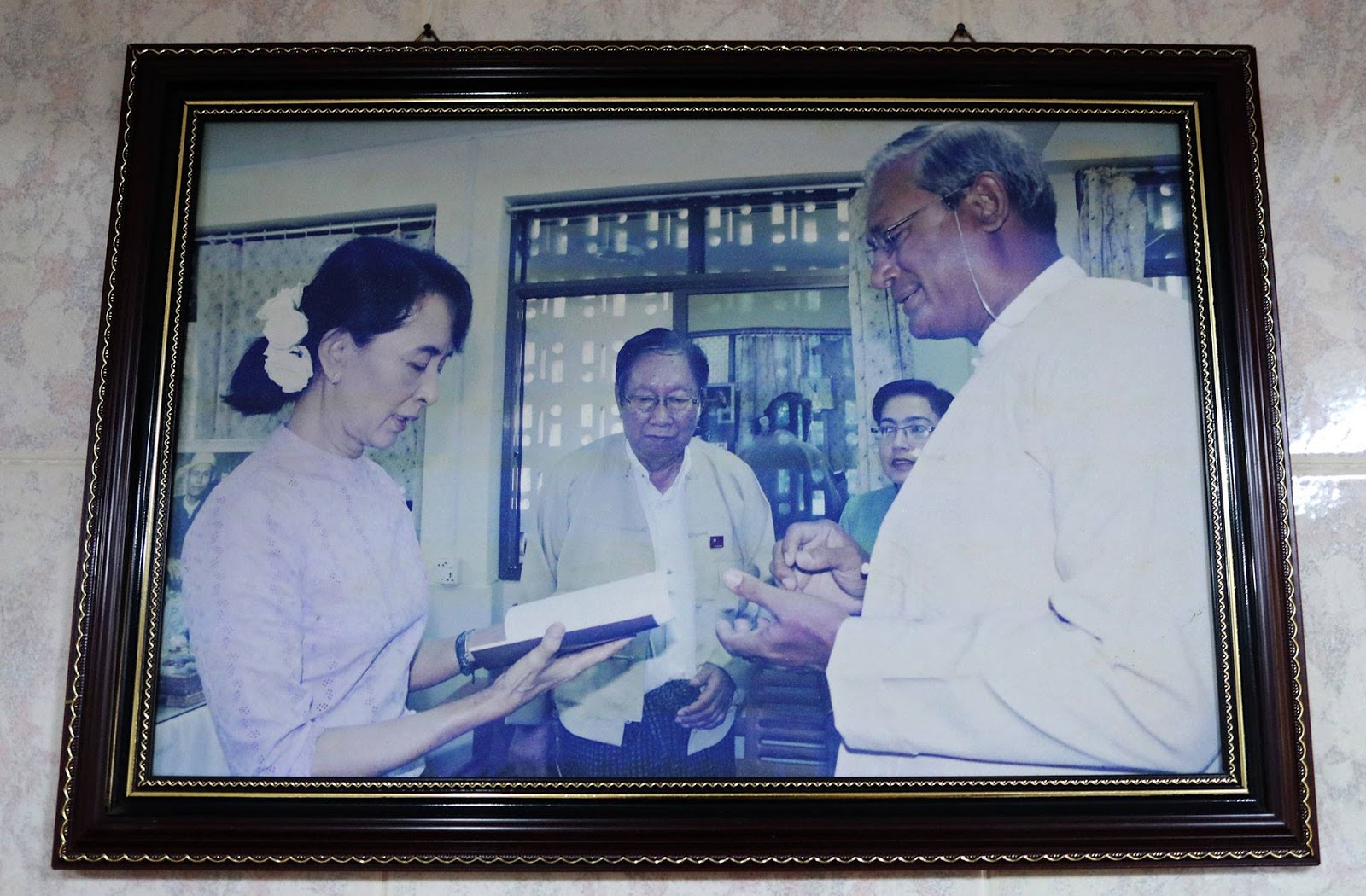 ေရြးေကာက္ပြဲမဲထည့္နည္းပညာေပးစာအုုပ္ကိုု ေဒၚေအာင္ဆန္းစုုၾကည္အား ဦးကုုိနီကေပးအပ္ခဲ့သည့္ဓာတ္ပံုမွာ ဦးကိုုနီ၏ ရံုုးခန္းႏွင့္အိမ္တိုု႔တြင္ ခ်ိတ္ဆြဲထားသည္။ (ဓာတ္ပံု/Ann Wang/Reuters)