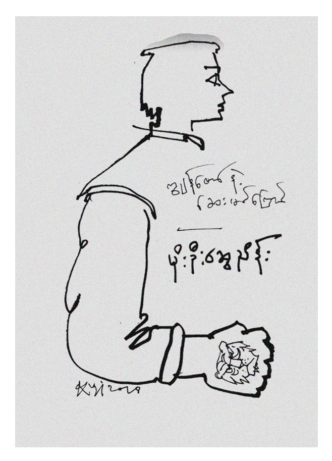 အမွန္ေတာ့ ေဆးမင္ေၾကာင္ထိုးတာနဲ႔ပတ္သက္လို႔ ကြၽန္ေတာ့္မွာ သီးျခားခံစားခ်က္႐ွိလွတာမဟုတ္ပါဘူး။ လူပ်ိဳေပါက္အရြယ္ စိတ္ခံစားမႈမ်ွသာပါ။ ေ႐ွးျမန္မာႀကီးေတြလို ေယာက္်ားပီသတဲ့ သေကၤတသ႐ုပ္သကန္ေတြလည္း ႐ွိဟန္မတူပါဘူး။ ေ႐ွ႕မွာ အစ္ကိုေတြ သူငယ္ခ်င္းေတြ စသျဖင့္ ထိုးတာေတြ႕လို႔ လိုက္ထိုးတဲ့ သေဘာေလာက္ပါပဲ။ သူမ်ားေတြမ်ား အသည္း ဓားစိုက္တဲ့ပံုတို႔၊ အသည္းပံုထဲ ခင္တို႔ ထိုးတာေတြ ေအာထလို႔။ ကိုယ္က ရည္းစားသနာေတြ ဘာေတြ မ႐ွိေတာ့ နာမည္ထိုး မ်ိဳးေတြ မလုပ္ျဖစ္ခဲ့ဘူး။ ၈ တန္းႏွစ္ေလာက္မွာ ေနာက္တစ္ပံု ထပ္ထိုးျဖစ္ေသးတယ္။ လက္ေမာင္းအိုးမွာ ၾကယ္ကို စပါးႏွံ ဝန္းထားတဲ့ပံု။ ဟား ဟား၊ အရာခံဗိုလ္လိုလို တံဆိပ္ႀကီး။