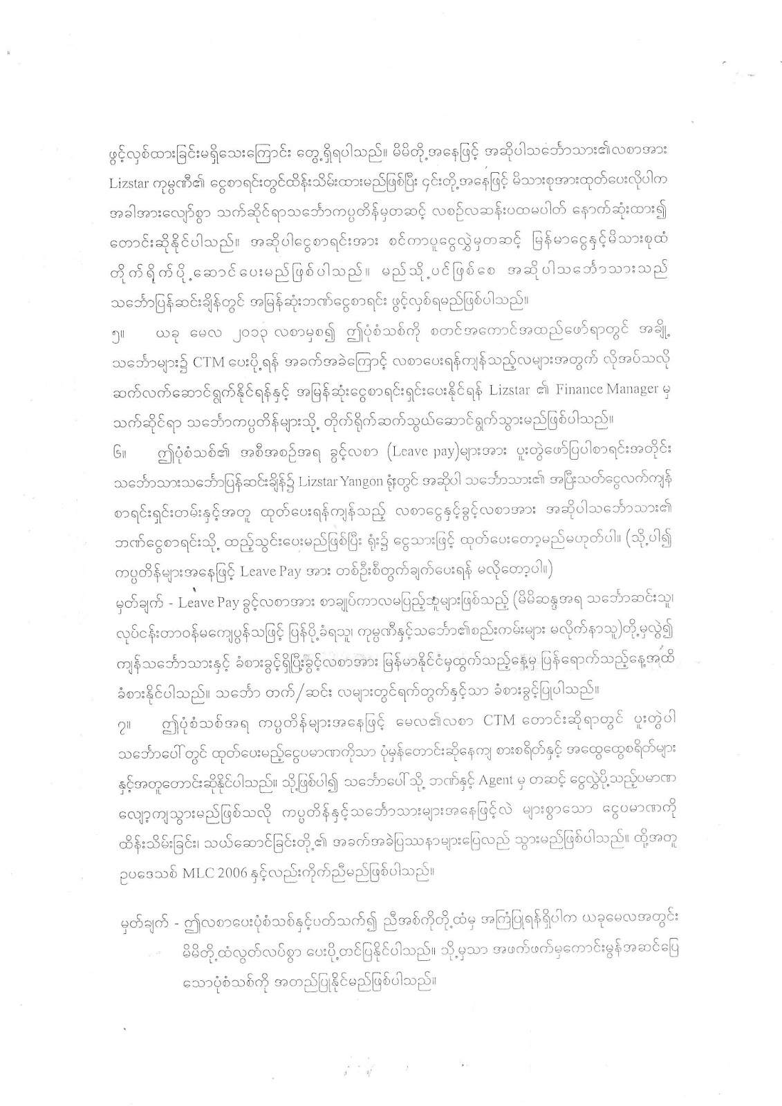 Maritime Labour Convention:MLC 2006 ဥပေဒ အရ Standard A2.2 – Wages, Paragraph(1) တြင္ တာ၀န္ထမ္းေဆာင္ေနေသာ သေဘၤာသားမ်ား၏ လစာေငြကို လစဥ္လတိုင္း ေပးေခ်ရန္ ၿပ႒ာန္းထားေသာ္ လည္း Lizstar ကုမၸဏီမွ ဦး၀င္းေဇာ္က ဥပေဒကို စနစ္တက် ခ်ဳိးေဖာက္ေနပါသည္။