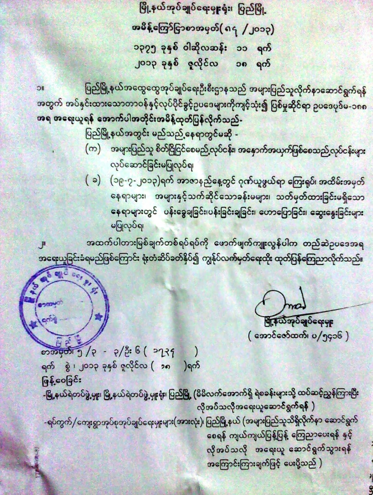 ျမိဳ႕နယ္အုပ္ခ်ဳပ္ေရးမွဴး၏ အမိန္႔ေၾကညာ