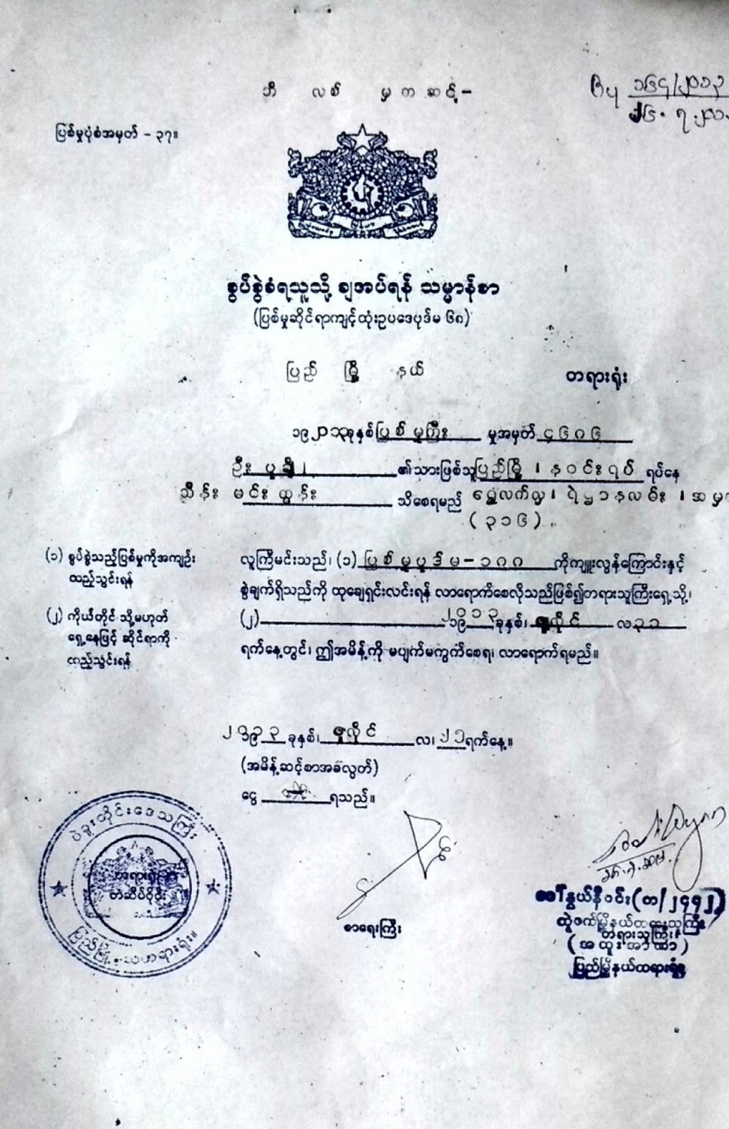 ျပည္ျမိဳ႕နယ္တရားသူၾကီး၏ သမၼန္စာ