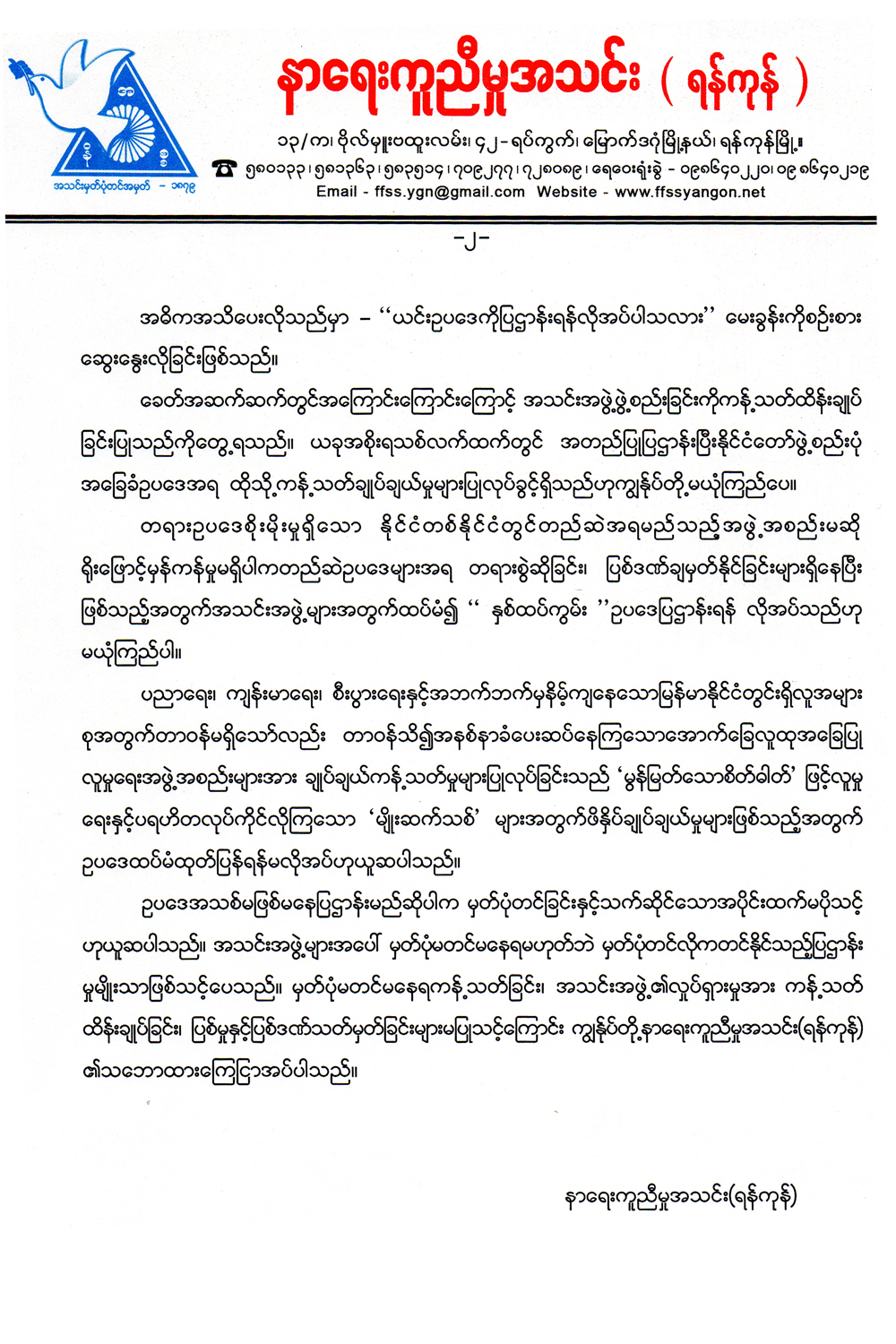 ဥပေဒအသစ္ မျဖစ္မေန ျပ႒ာန္းမည္ဆိုပါက မွတ္ပံုတင္ျခင္းႏွင့္ သက္ဆိုင္ေသာ အပိုင္းထက္ မပိုသင့္ဟု ယူဆပါသည္။ အသင္းအဖြဲ႔မ်ားအေပၚ မွတ္ပံုမတင္မေနရမဟုတ္ဘဲ မွတ္ပံုတင္လိုက တင္ႏိုင္ သည့္ ျပ႒ာန္းမႈမ်ိဳးသာ ျဖစ္သင့္ေပသည္။ မွတ္ပံုမတင္မေနရ ကန္႔သတ္ျခင္း၊ အသင္းအဖြဲ႔၏လႈပ္႐ွားမႈအား ကန္႔သတ္ထိန္းခ်ဳပ္ျခင္း၊ ျပစ္မႈႏွင့္ ျပစ္ဒဏ္သတ္မွတ္ျခင္းမ်ား မျပဳသင့္ေၾကာင္း ကၽြႏု္ပ္တို႔ နာေရးကူညီမႈ အသင္း(ရန္ကုန္)၏ သေဘာထား ေၾကျငာအပ္ပါသည္။