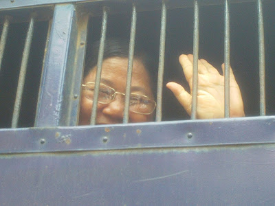 (Photo – Facebook, Naw Ohn Hla waving from window of prison van, 2013)