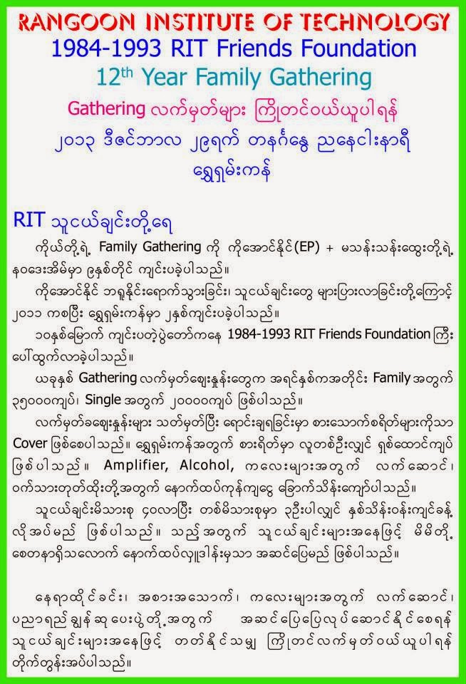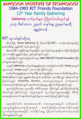 ၁၉ ၈၄ မွ ၁၉ ၉ ၃ ႏွစ္ စာသင္ႏွစ္မ်ားအတြင္း ေက်ာင္းေနဖက္ျဖစ္ခဲ့ၾကသူ ရန္ကုုန္စက္မႈတကၠသိုုလ္ေက်ာင္းသားေဟာင္းမ်ား၏ (1984-1993) RIT Friends Foundation အဖြဲ႔က လာမည့္ ဒီဇင္ဘာ ၂၉ တြင္ ျပည္တြင္း ျပည္ပ စုုေ၀းျပီး ရန္ကုုန္ျမိဳ့တြင္ မိတ္ဆုုံၾကမည္ျဖစ္ျပီး၊ သားသမီးမ်ားထဲက ပညာထူးခၽြန္သူမ်ားကိုု စုုေပါင္းဂုုဏ္ျပဳပြဲ က်င္းပရန္ ေဆာ္ၾသေနၾကပါတယ္။