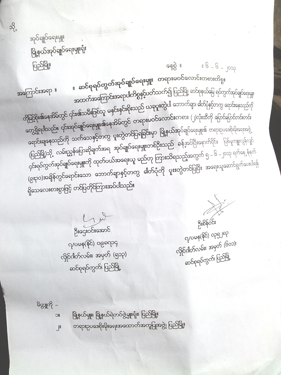 အေၾကာင္းအရာ။  ။ျပည္သူ႔ကိုယ္က်င့္တရားကိုဆန႔္က်င္ေသာ (၂) လံုးေလာင္းကစားလုပ္ငန္းကိုလုပ္ကိုင္သူ ျပည္ျမိဳ႕ဆင္စု ရပ္ကြက္အုပ္ ခ်ဳပ္ေရးမွဴးအား ဥပေဒႏွင့္အညီ အေရးယူေဆာင္ရြက္ရန္ သက္ဆိုင္ရာသို႔တိုင္ၾကားေသာ္လည္း ေလာင္းကစားလုပ္ပိုင္ခြင့္ရရိွေနေသာ ေၾကာင့္ အေရးေဆာင္ရြက္မႈမရိွျခင္းႏွင့္ ရပ္ကြက္ သို႔မဟုတ္ ေက်းရြာ အုပ္စုအုပ္ခ်ဳပ္ေရးဥပေဒ ပုဒ္မ (၅) ပုဒ္မခြဲ (စ) (စ်)၊ ပုဒ္မ (၁၃)ပုဒ္မခြဲ (က) (ဃ) (ဋ) (ဌ)၊ ပုဒ္မ (၁၅) ပုဒ္မခြဲ(ဂ) တို႕ကို ခ်ဳိးေဖာက္က်ဴးလြန္ျပီး အုပ္ခ်ဳပ္ေရးမွဴးျဖစ္ေနေသာေၾကာင့္ ရပ္ကြက္တြင္ေနထိုင္သ ူမ်ား ၏ တရားဥပေဒစိုးမိုးေရး၊ ရပ္ကြက္ေအးခ်မ္းသာယာေရးႏွင့္ ျပည္သူ႔အက်ဳိးစီးပြားတို႔ကို ထိခိုက္ပ်က္စီးေစႏိုင္သျဖင့္ အခြင့္အေရးမ်ား    ျပန္လည္ရရိွႏိုင္ရန္အတြက္ အျမန္ဆံုး ထိထိေရာက္ေရာက ္စံုစမ္းစစ္ေဆးအေရးယူေပးပါရန္ တိုင္ၾကားျခင္း။