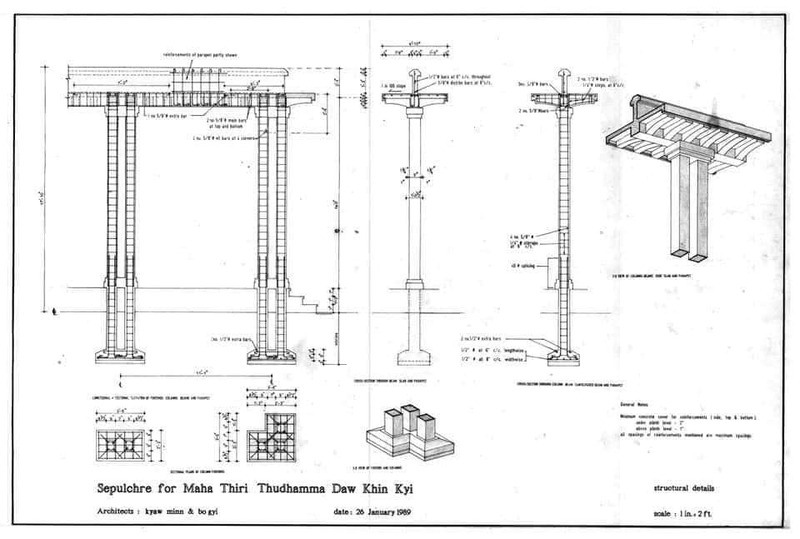 ". . .ဒေါ်ခင်ကြည်၏ဂူဗိမာန်ကို ဒေါ်အောင်ဆန်း စုကြည်၏စိတ်ကူးအတိုင်း မိခင်ကြီးအမြဲထိုင်နေကျ ပေါ်တီကိုဒီဇိုင်းပုံ သဏ္ဌာန်အဖြစ် ဗိသုကာ ဦးရွှေနှင့် ဦးကျော်မင်းတို့က ပုံဖော်ကြပါသည်။ ဆောက်လုပ်ရေး တာဝန်ကို ဆောက်လုပ်ရေးဝန်ကြီးဌာနမှ အင်ဂျင်နီယာ ဦးဘိုကြီးက တာဝန်ယူ တည်ဆောက်ပေးခဲ့ခြင်း ဖြစ်ပါသည်။'