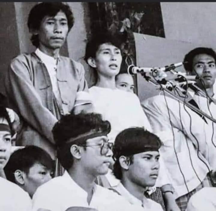 ရှစ်လေးလုံးအရေးတော်ပုံအစမှာ သူဟာသပိတ်မှောက်ကျောင်းသား။သြဂုတ် ၂၅ ဒေါ်အောင်ဆန်းစုကြည်ရွှေတိဂုံအနောက်မုခ်မှာတရားဟောတော့ သူကအန်တီ့ဘေးရောက်သွားရော။နောက်တော့အန်တီ့ခြံထဲက သုံးရောင်ခြယ်မြတ်စံဖြစ်လာတယ်။