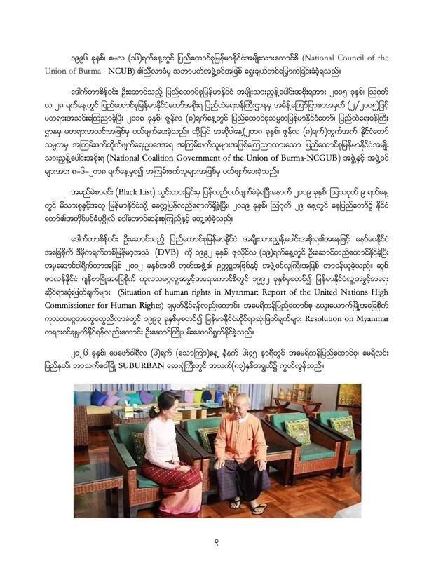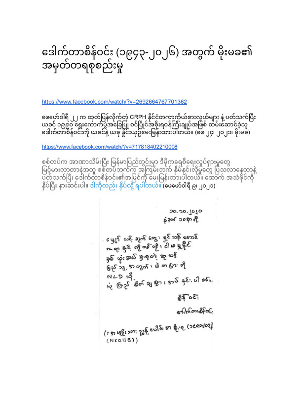 စာကြွင်း – ပြည်သူတင်မြှောက်ထားသော ပြည်သူ့အစိုးရကို လေးစားရိုသေသောအားဖြင့် တိုင်းပြည်တာဝန် ထမ်းဆောင်ခြင်းနှင့် ကူညီခြင်းမှ လွဲ၍ ကျန်တာမလုပ်ပါဟု ရေးထိုးခဲ့ပြီးပါပြီ။ (၇၊၇၊ ၂၀၁၆ work history form) ။ ကျန်တဲ့ ခံဝန်ချက်များ ထပ်မထိုးသင့်တော့ပါ။ အိုခြင်းကိုလည်း အသက်အရ သုံးနှုံးထားပါသည်။ ဉာဏ်အားတွင်တော့ သတင်းစာတွင် ဖတ်ရသော “လေ့ကျင့်ထားသော အသက် ၇၀ကျော်၏ ဉာဏ်အားသည် အသက် ၂၀ နှင့် အတူတူပင် ဖြစ်ကြောင်း” ၏ နမူနာပြယုဂ် တခုဖြစ်ပါသည်။ အခြားပြယုဂ်များလည်း အများကြီး တွေ့နေရပါသည်။ နောက်ထပ်ပြယုဂ်တခုမှာတော့ ရက်ပိုင်းအတွင်း တွေ့ခဲ့ရသော အသက် ၉၈ နှစ်အရွယ်တွင် ဟင်းချက်နိုင်တုန်း ဖြတ်လတ်နေတုန်း၊ နှစ်ပေါင်းများစွာ ဝေးကွာနေသူများကို နာမည်နဲ့တကွ မေးနိုင်သော မှတ်ဉာဏ်အား ကောင်းဆဲဖြစ်သော ဗိုလ်ချုပ်ကတော် ဘွားဘွား ဒေါ်ခင်ကြည်၏ ညီမ အန်တီ မာ ဖြစ်ပါသည်။