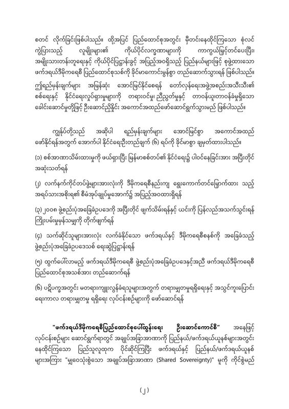 (၅) ထွက်ပေါ်လာမည့် ဖက်ဒရယ်ဒီမိုကရေစီ ဖွဲ့စည်းပုံအခြေခံဥပဒေနှင့်အညီ ဖက်ဒရယ်ဒီမိုကရေစီ ပြည်ထောင်စုအသစ်အား တည်ဆောက်ရန်