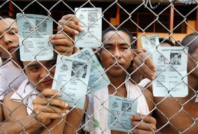 The photos were taken on last Thursday showing hundreds of Burmese workers detained at prison camp in Kuala Lumpur, Malaysia. One high ranking Malaysian immigration official was arrested for selling Burmese to human smugglers, according to his lawyer. (Photo – AP)