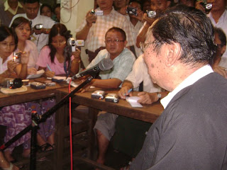 (photo – at NLD party headquarter, press conference, U Nyan Win with reporters)
