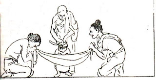 (Novitiation ceremony; the boy sat obediently middle of his parents, the head was going to be shaved by the monk and his parents with happiness proudly held a snow-white sheet to receive his hair.)