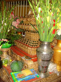 | Paying homage to the SunlunSayadaw, and offering yellow robes, towels, candles, incenses, and the fruits I brought from Rangoon. |