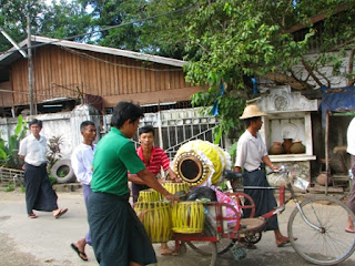 (The three-wheel carrier drivers made their own wooden triangular structures for KhaHtaine donation. Photo Credit – Dr. Soe Min Thein.)