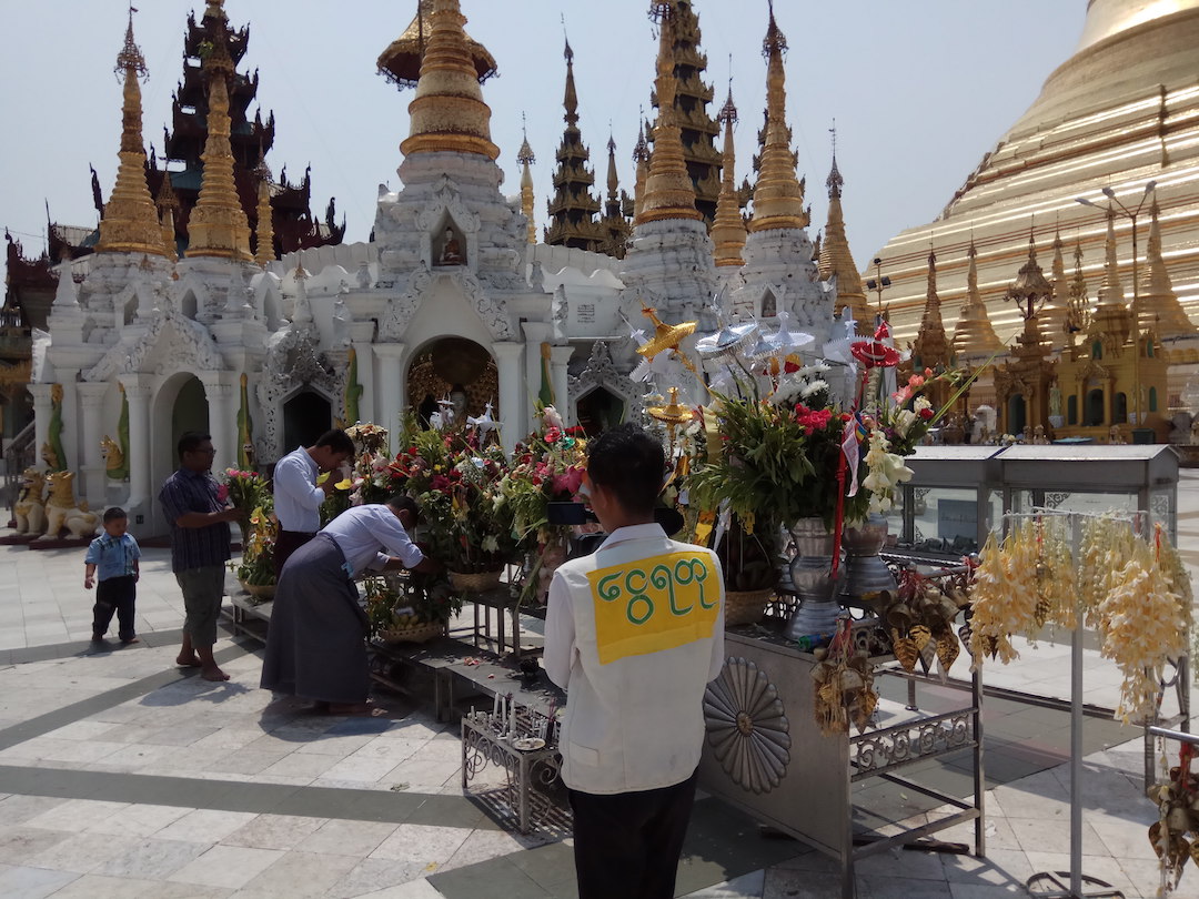 I was going to the Shwedagon pagoda during Thingyan holidays. I saw people were crowded on the pagoda ground. Some meditating, some offering candles, flowers, and colourful things, and some paid respect, etc.