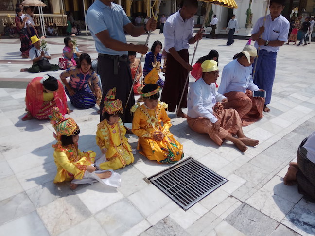 (The families with their little boys, and girls altogether having good deeds at the Shwedagon Pagoda.)