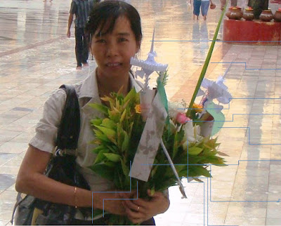 On the pagoda platform, people are buying not only flowers and leaves, but also candles, coloured flags and streamers to offer at the foot of the pagoda in honour of the stupa where Buddha’s relics are enshrined. Such things are very colourful too and they are full of meaning to Burmese Buddhists.