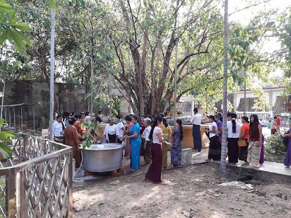 After the ceremony, people can pour water on the sacred tree – Bodhi Tree in the Sunlun campus. There were Nethar (Burmese Thanakhar – natural make-up) were already prepared mixing with water, and for throwing together into the Sacred Tree.