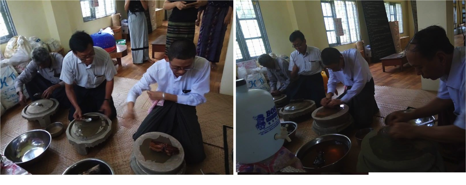 For having Nethar (Burmese natural make-up), Sayadaw prepared 4 Big circular stone slabs at Sunlun monastery. They were ready for you for rubbing the Nathar bark with a few drop of water on the stone face, and by your circular motions, creamy natural make-up appeared. It was a very hard work. Really! I only could have done a spoonful of Nethar creamy for 10 minutes of rubbing the bark! For those taking-part ceremony, the Nethar creamy would be added into the water for pouring into the Sacred Tree. It was the act of honoring Buddha’s Sacred Day.