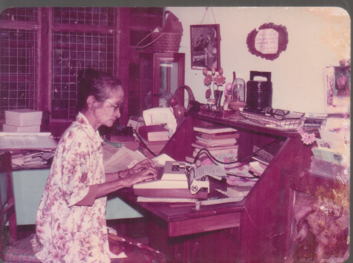 (Grandma with her electric typewriter. Grandma’s desk was so attractive, and it played a very important role of great writer’s life.)