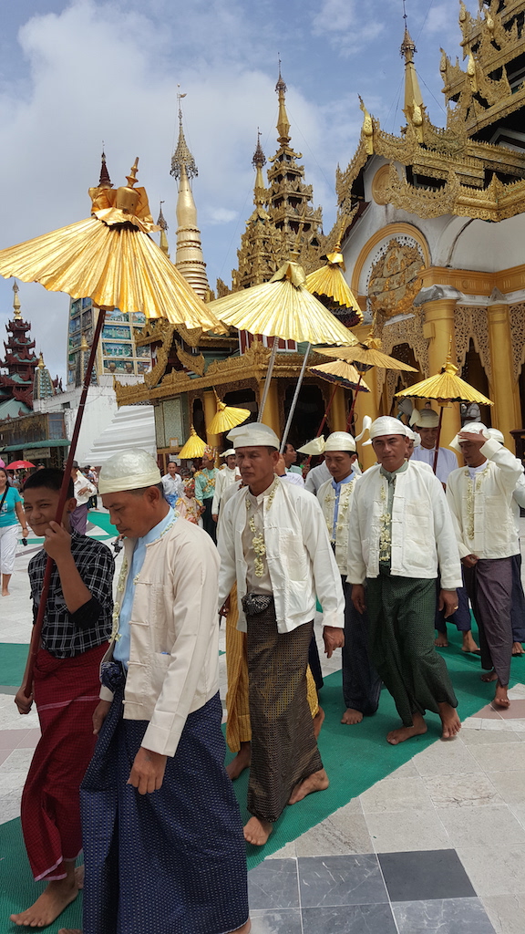 For the Buddhist, the scene we saw was fully aware that. But for the non-Burmese reader, it was called the novitiation (becoming monks) ceremony. Women, and girls might be relatives (mothers, aunts, or sisters, or wives, etc) to the men, and boys (‘becoming monks’). Women, and girls in Burmese traditional style, seemed pleased, and happy, were leading the train. Men wore a Burmese traditional dress, and boys with princely robes, before heads shave, were walking behind ladies. Some volunteers (they might also be their relatives, and friends) hold their gold umbrellas to protect ‘future monks, and novices’ from the sunshine. They planned to walk as keeping the Shwedagon pagoda on the right side in the way of complete circling the pagoda. They would later take them to the monastery, and put under the care of monks.