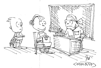 (Mother met his teacher for his misadventures at school. The teacher said, ‘He never got into a fight. But he like to watch a good fight and shout praises, … that got him into all kind of trouble….’)(Drawn by – Maung Yit.)