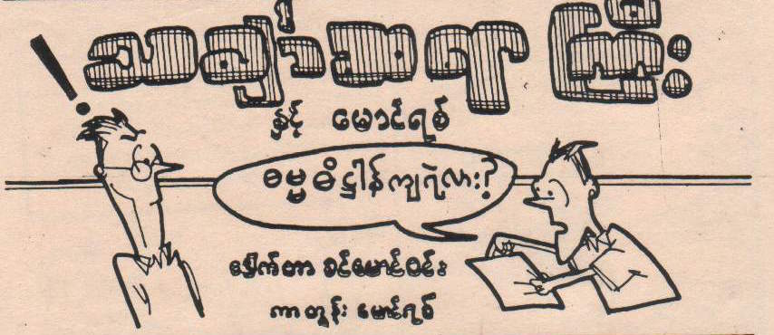 My twin brother was already a cartoonist. Since he was a child, he wrote cartoons at his notes, and created the stories. I also mimicked his drawing. He began posted his cartoons on the cartoon box at R.I .T (Rangoon Institute of Technology), and was known among R.I.T students. He had a pen name, Maung Yit. I envied him, and I wanted to be a cartoonist like him. But my drawings were bad, and awful. The family applauded his cartoons, and I thought he became smarter, and smarter. Grandma let him drew for her articles, and father also asked his help to draw for his too. He was one of the important members in the family.