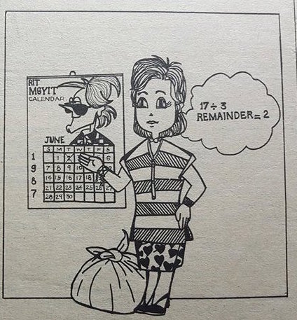 (I marked by a cross on the day at the calendar on which the washerwoman comes by dividing by three the number representing the day of the month as a daughter of the mathematician.) (Illustrated by Maung Yit)