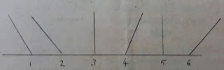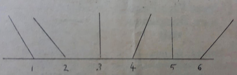 In this figure, the reader will see six straight lines which meet another straight line. The lines are numbered one to six.The reader can easily see which of the lines make right angles with the line they meet.The lines three and five make right angles while others do not.