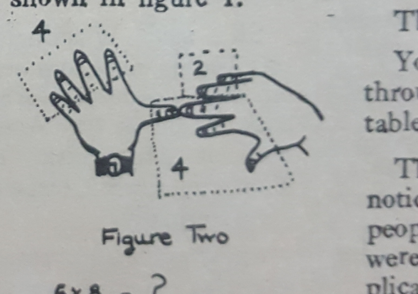 To multiply, put the tips of the two fingers representing the required numbers together.In figure two, we are multiplying six by eight.