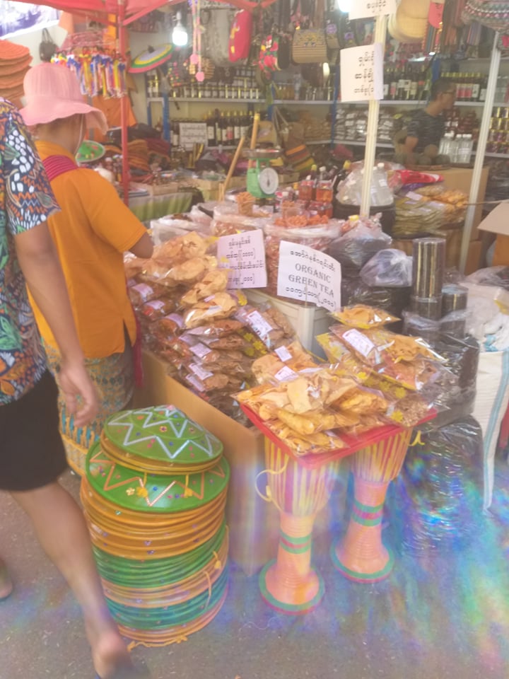 The grounds were placed in order by shops, and market stalls or show rooms. Products from all over the country such as Kachin, Kayin, Kayar, Mon, Tanatharyin, Rakhine, Shan, Chinn and Myanmar – representing central, northern hill tracts, lowlands and delta areas of Burma. There were snacks, and foods that we could taste there or take them home.