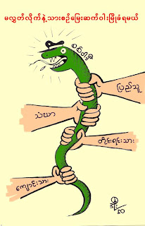 ဟူ၍ ေဟာေျပာပါသည္။ ေက်ာင္းသားမ်ားက တေ၀ါေ၀ါႏွင့္ ၾသဘာေပးၾကခ်ိန္၀ယ္ တြဲေရး-ခြဲေရး လူႀကီးမ်ားကေတာ့ မ်က္ႏွာပ်က္ ေဒါပြေနၾကေတာ့သည္။