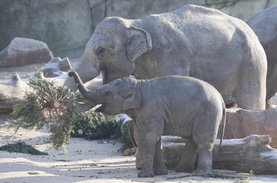 ခရစ္စမတ္သစ္ပင္ကုိ စားေသာက္ေနေသာ ျမန္မာျပည္ဖြား ဆင္မႀကီး သီဟျဖဴ (Thi Ha Phyu) ႏွင့္ သားငယ္ မင္းဂြ်န္ (Ming Jung / My Boy) တုိ႔ကုိ ယမန္ေန႔က ေတြ႔ရပုံ။ ဆင္မႀကီးမွာ အသက္ ၂၈ ႏွစ္ရိွၿပီျဖစ္ၿပီး ဆင္ေပါက္ေလးမွာ ၁ ႏွစ္ခဲြ ျဖစ္သည္။ ဆင္မ်ားကုိ ခရစ္စမတ္သစ္ပင္မ်ား ေကြ်းလ်က္ရိွေၾကာင္း ၎တုိ႔ေရာက္ရိွေနသည့္ ဂ်ာမဏီႏုိင္ငံ၊ ကုိလုံးၿမိဳ႕ တိရိစၦာန္ဥယ်ာဥ္ ညႊန္ၾကားေရးမွဴးက ရွင္းျပသည္။ ဆင္တေကာင္လွ်င္ ခရစ္စမတ္ ထင္းရွဴးပင္ သုံးပင္ ေန႔စဥ္ စားသုံးေၾကာင္း၊ ထင္းရွဴးပင္ကုိ စားျခင္းျဖင့္ ဆင္တုိ႔၏သြားမ်ား သန္႔ရွင္းစင္ၾကယ္ေစေၾကာင္း သိရသည္။ (photo: Reuters)