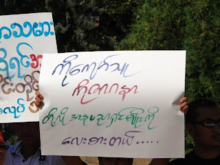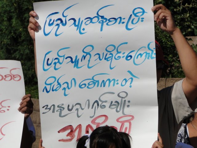 (ဓာတ္ပုံ – ယခင္ ၾသဂုတ္ ၂၈က မင္နီဆိုးတားတြင္ ဆႏၵျပခဲ့စဥ္က ျပည္သူတို႔ ကိုင္သည့္ ပိုစတာမ်ား၊ (ဓာတ္ပုံ ခြန္မ်ဳိး၊ အင္တာနက္)