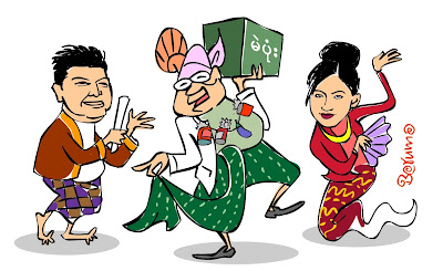 “ေၾသာ္..ဂ်ီး ေဒၚ ရယ္..က်ေနာ္လည္း စိတ္မ၀င္ စား ပါ ဘူး..။ စိတ္ မ၀င္စား ေပမယ္႔ က်ေနာ္ တို ႔ က သူတို႔ ဘာ ေတြ မတရား လုပ္ တယ္ ဆိုတာေတြကို ေစာင္႔ၾကည္႔ ျပီး…ကမၻာက သိေအာင္ ေဖာ္ထုတ္ ရမယ္ေလဗ်ာ…။ ဒီ…ေသငနာၾကီးက… သူ႔မွာ ပိုက္ဆံေတြ ဘယ္ေလာက္ ရွိေနတယ္ ဆိုတာေတာင္ မသိေအာင္ကို ခ်မ္းသာေနတာ တဲ႔…။ သူ႔ကို မဲထည့္မယ္ ဆိုရင္ ၾကိဳက္ရာ အခ်က္ (၅) ခ်က္ ေတာင္း ..သူ ေပးနိုင္တယ္ တဲ႔….ဟိ…ဟိ..။ သူ ႔ ေဘး က သူ႔သား ဇနီး မင္းသမီးေလး နံတာကိုင္ ကို ေတာင္းလိုက္ရ ေကာင္းမလား လို႔…. ေတြးေနတာ… ဟီး ဟီး…”