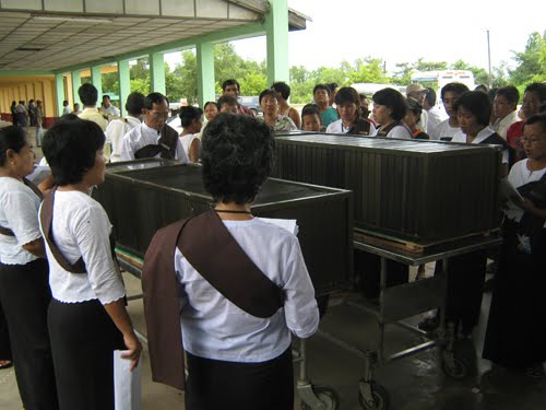 ရင္ႏွင့္ဖြယ္ ျဖစ္ရပ္ကေလးတခု ။ ။ ၇.၁၀.၂၀၁၀ (ၾကာသပေတးေန႔) နံနက္ ၉း၃၀ နာရီအခ်ိန္တြင္ ေတာင္ဒဂံုၿမိဳ႕နယ္ေန ကြယ္လြန္သူ ေဒၚအုံုးရီ အသက္ ၆၇ ႏွစ္ ႏွင့္ သားျဖစ္သူ ဦးခင္ဦး အသက္ ၄၈ ႏွစ္တို႔၏ ႐ုပ္အေလာင္းမ်ားကို နာေရးကူညီမႈအသင္း(ရန္ကုန္)က အတြင္းေရးမွဴး ေဒၚသန္းျမင့္ေအာင္ႏွင့္ အသင္းသားမ်ား၊ ဝန္ထမ္းမ်ားမွ နိဗၺာန္ယာဥ္ ၂ စီးျဖင့္ သြားေရာက္ သယ္ေဆာင္ကာ က်ီစုသုႆန္သို႔ ပို႔ေဆာင္မီးသၿဂႋဳဟ္ေပးခဲ့သည္။