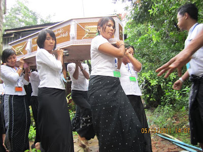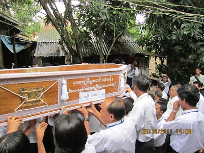 ထို႔ေနာက္ ကြယ္လြန္သူ ေဒၚလွဆိုင္၏ ႐ုပ္အေလာင္းအား အေခါင္းထဲသို႔ ထည့္သြင္း၍ အသင္းသူ /သားမ်ားတို႔မွ လက္ဆင့္ကမ္း၍ နိဗၺာန္ ယာဥ္ေပၚသို႔ ပို႔ေဆာင္ကာ ေရေ၀းသုႆန္သို႔ ၀တ္႐ြတ္အဖြဲ႔မွ ေမတၱာပို႔သံ၊ သံေ၀ဂအလကၤာ ရြတ္ဖတ္သံတို႔ျဖင့္ လႊမ္းျခံဳကာ ပို႔ေဆာင္ သၿဂႋဳလ္ေပးခဲ့သည္။