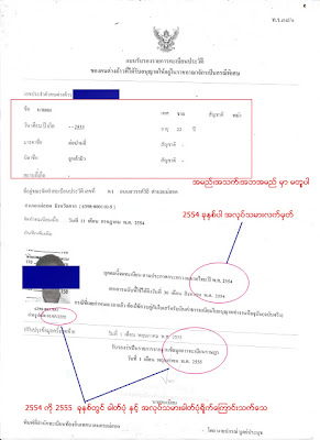 ျမ၀တီ-တစ္ဘက္ကမ္း မဲေဆာက္တြင္ ဧၿပီလ ၂၀ ရက္ေနေလာက္က မဲေဆာက္ ေထ့စၥပန္း (စည္ပင္) ႐ံုးမွ ထိုင္းႏွစ္ ၂၅၅၄ ခုႏွစ္က လက္က်န္ေနထိုင္ခြင့္လက္မွတ္မ်ားကို လူစားထိုးၿပီး ျမန္မာျပည္သား ေရြ႕ေျပာင္းအလုပ္သမားမ်ား ေနထိုင္ခြင့္လက္မွတ္မ်ားကို တရား၀င္ လုပ္ ေဆာင္ေပးလိုက္ပါတယ္။သို႔ေသာ္ လူစားထိုးရသည့္အတြက္ နာမည္-အသက္-အဖအမည္တို႔မွ ယခင္လူေဟာင္းအမည္ႏွင့္ အသက္ျဖစ္ၿပီး ယခု ဓာတ္ပံုရိုက္သူ၏ ပံု ႏွင့္ လက္ေဗြ ျဖစ္ေသာ ေထာ္ေလာ္မ်ားကို ၃၅၀၀ ဘတ္မွ ၆၀၀၀ ဘတ္အတြင္း ယူၿပီး ျပဳလုပ္ေပးခဲ့ပါသည္။သို႔ေသာ္လည္ ဓာတ္ပံုေအာက္တြင္ ဓာတ္ပံု႐ုိက္သည့္ေန႔ 2555 ဆိုသည့္ခုႏွစ္ပါရိွပါသည္။