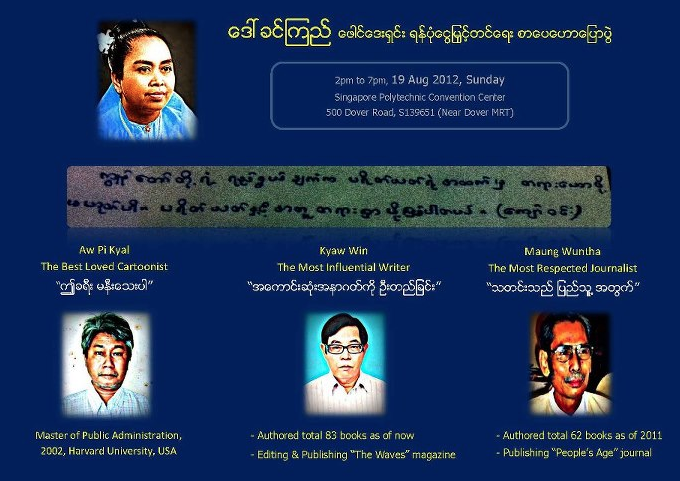 August 19, 2012 က စကၤာပူမွာ က်င္းပေသာ ေဒၚခင္ၾကည္ေဖာင္ေဒးရွင္း စာေပေဟာေျပာပြဲသည္ အရင္ က်ေနာ္တို႔ နားေထာင္ေနၾက၊ ေတြ႔ေနၾက စာေပေဟာေျပာပြဲ ပံုစံမ်ားႏွင္႔ မတူဘဲ အေၾကာင္းအရာတစ္ခုကို ဦးတည္ၿပီး ဆရာၾကီး သံုးေယာက္ သပ္သပ္ဆီ ေဆြးေႏြးသြားသလို ျဖစ္ေနခဲ႔သည္ ဟု ထင္သည္။