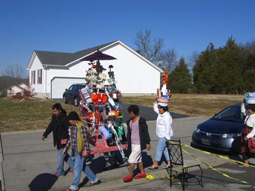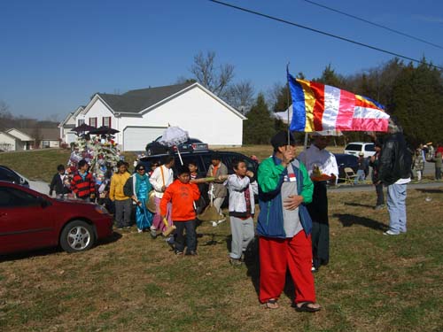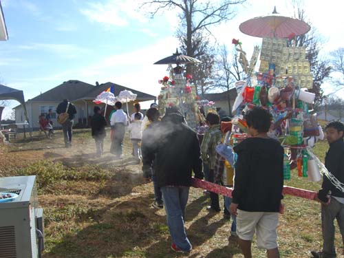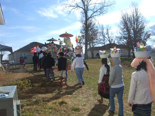 ေန႕လည္ (၁၂) နာမွာ ပစၥည္းပေဒသာပင္ ေငြပေဒသာပင္မ်ားကုိ ေလးေယာက္စီ ပေဒသာပင္ကုိ ထမ္းသည့္သူကထမ္းၾကသလုိ သကၤန္း ေတြလည္း ကုိယ္စီပုိက္လုိ႕ ေက်ာင္းတုိက္ကုိ (၃)ေခါက္ လွည္႕လည္ၾကပါတယ္။