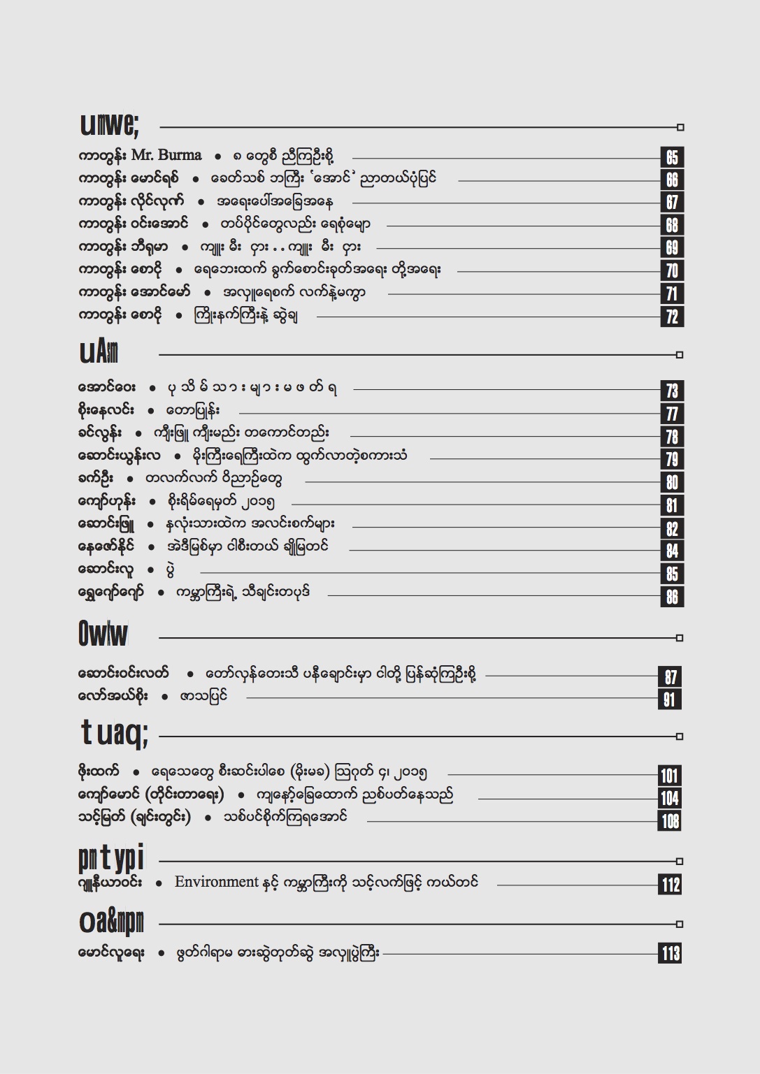 မဂၢဇင္း ဘာလုုိ႔ ေနာက္က်တာလဲ။ ေရၾကီးေနလိုု႔၊ မိုုးရြာေနလိုု႔ စတဲ့ သဘာ၀ေဘးေတြ ေၾကာင့္လား၊ မီးပ်က္ေနလိုု႔၊ ဘတ္စကားေတြ သပိတ္ေမွာက္လိုု႔ စတဲ့ ရန္သူမ်ား ၅ပါး ရန္ေၾကာင့္လား ေမးမယ္ဆိုုရင္ေတာ့ တခုုမွ မဟုုတ္ပါဘူး။ ထုုံးစံအတုုိင္း ေနာက္က်ခ်င္လိုု႔ ေနာက္က်တယ္လိုု႔ပဲ ကိုုယ့္အျပစ္ကိုု ၀န္ခံ ေတာင္းပန္လိုုက္ပါတယ္။
