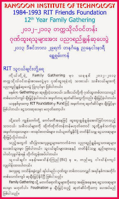 ၁၉ ၈၄ မွ ၁၉ ၉ ၃ ႏွစ္ စာသင္ႏွစ္မ်ားအတြင္း ေက်ာင္းေနဖက္ျဖစ္ခဲ့ၾကသူ ရန္ကုုန္စက္မႈတကၠသိုုလ္ေက်ာင္းသားေဟာင္းမ်ား၏ (1984-1993) RIT Friends Foundation အဖြဲ႔က လာမည့္ ဒီဇင္ဘာ ၂၉ တြင္ ျပည္တြင္း ျပည္ပ စုုေ၀းျပီး ရန္ကုုန္ျမိဳ့တြင္ မိတ္ဆုုံၾကမည္ျဖစ္ျပီး၊ သားသမီးမ်ားထဲက ပညာထူးခၽြန္သူမ်ားကိုု စုုေပါင္းဂုုဏ္ျပဳပြဲ က်င္းပရန္ ေဆာ္ၾသေနၾကပါတယ္။